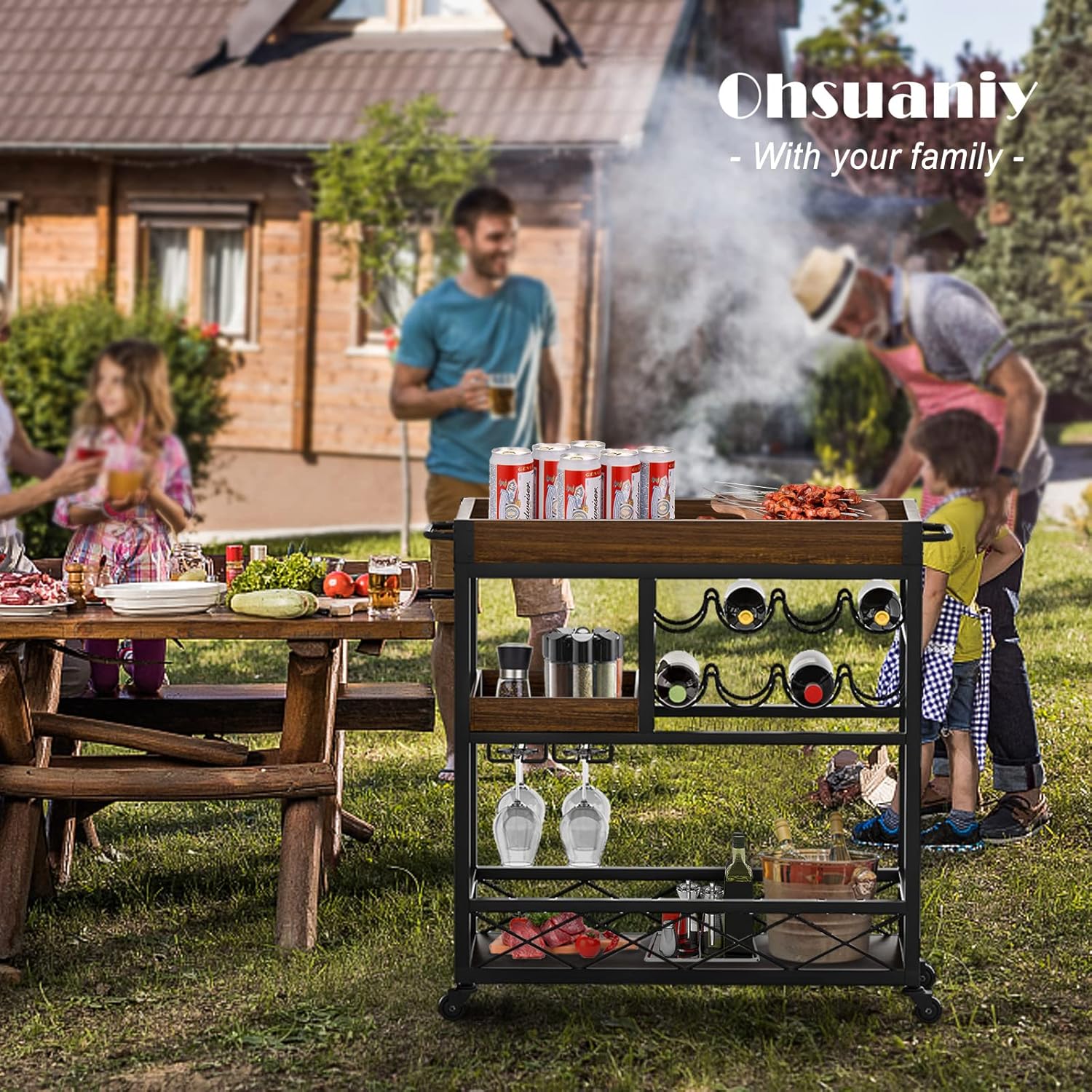 Bar Cart Industrial Mobile Kitchen Serving Carts for Home 3 Tier Storage Trolley with Wine Rack Glasses Holder Two Portable Trays Universal Casters with Brakes Rustic Rolling Cart for Indoor Outdoor